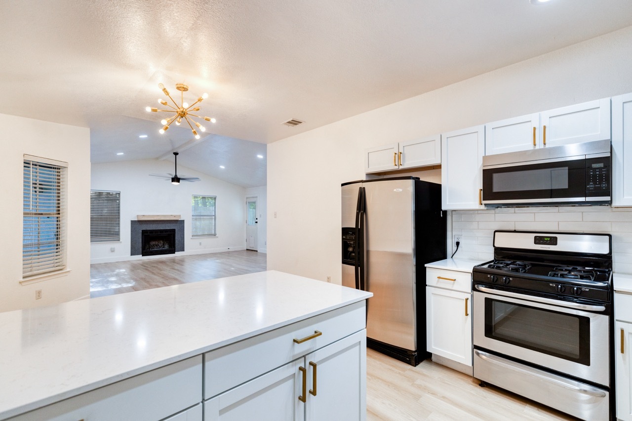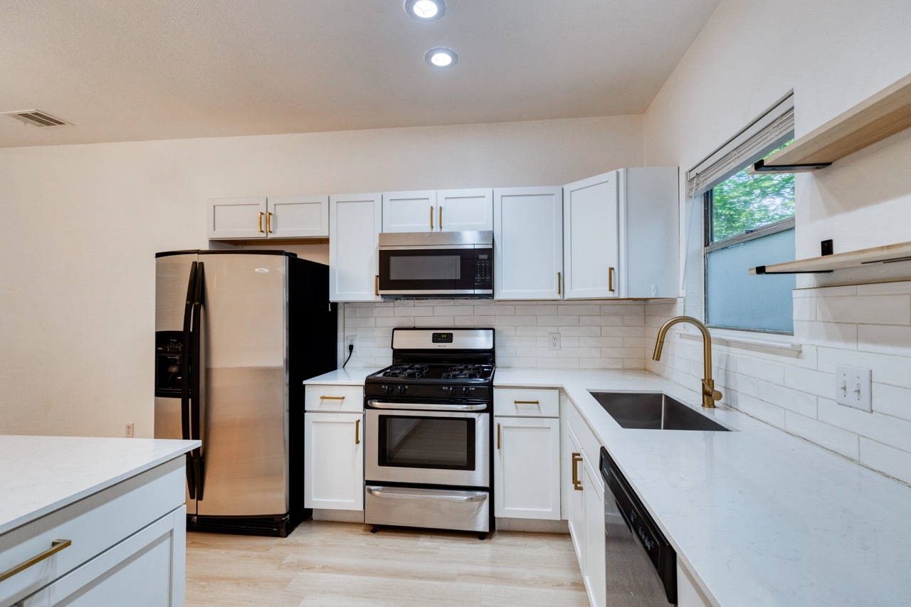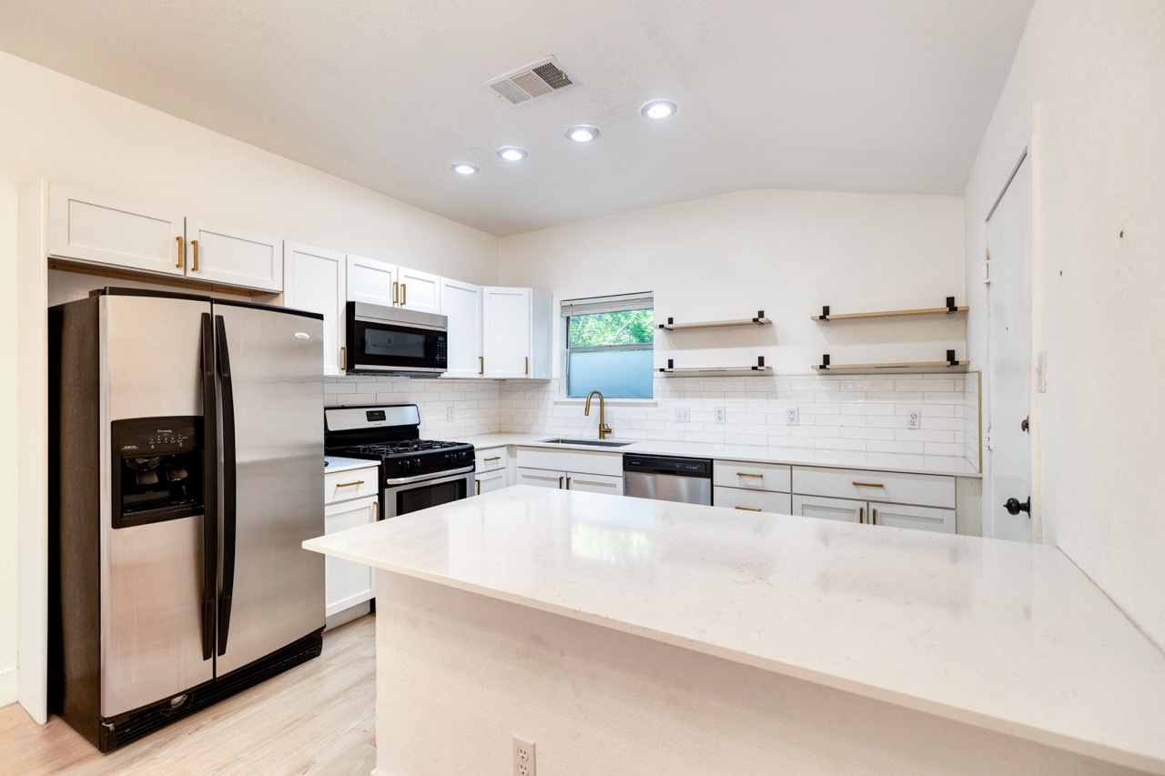 Welcome to your dream home in vibrant South Austin! This beautifully renovated 3-bedroom, 2-bath home is filled with modern charm. Enjoy an open-concept layout with vaulted ceiling and abundant natural light. The updated kitchen boasts stainless steel appliances, white granite countertops and gold accent finishes. Three generous bedrooms provide ample space for rest, each featuring fresh paint and new flooring. Both bathrooms have been fully renovated, showcasing stylish fixtures, modern vanities, and beautiful tile work. Step outside to your private backyard, ideal for gatherings or quiet evenings under the stars. The home is also conveniently located a block away from a tranquil park. Situated in a friendly neighborhood, you're just minutes away from local shops, eateries, and trails. This an ideal spot for anyone looking to enjoy the best of South Austin living.