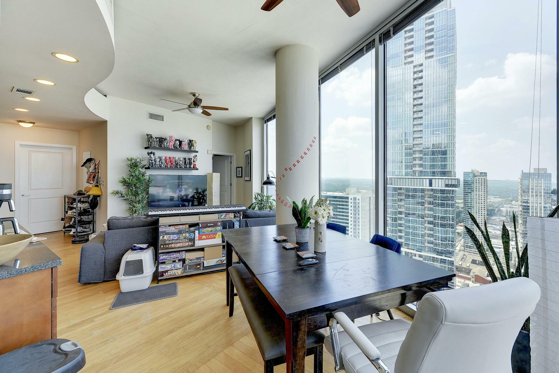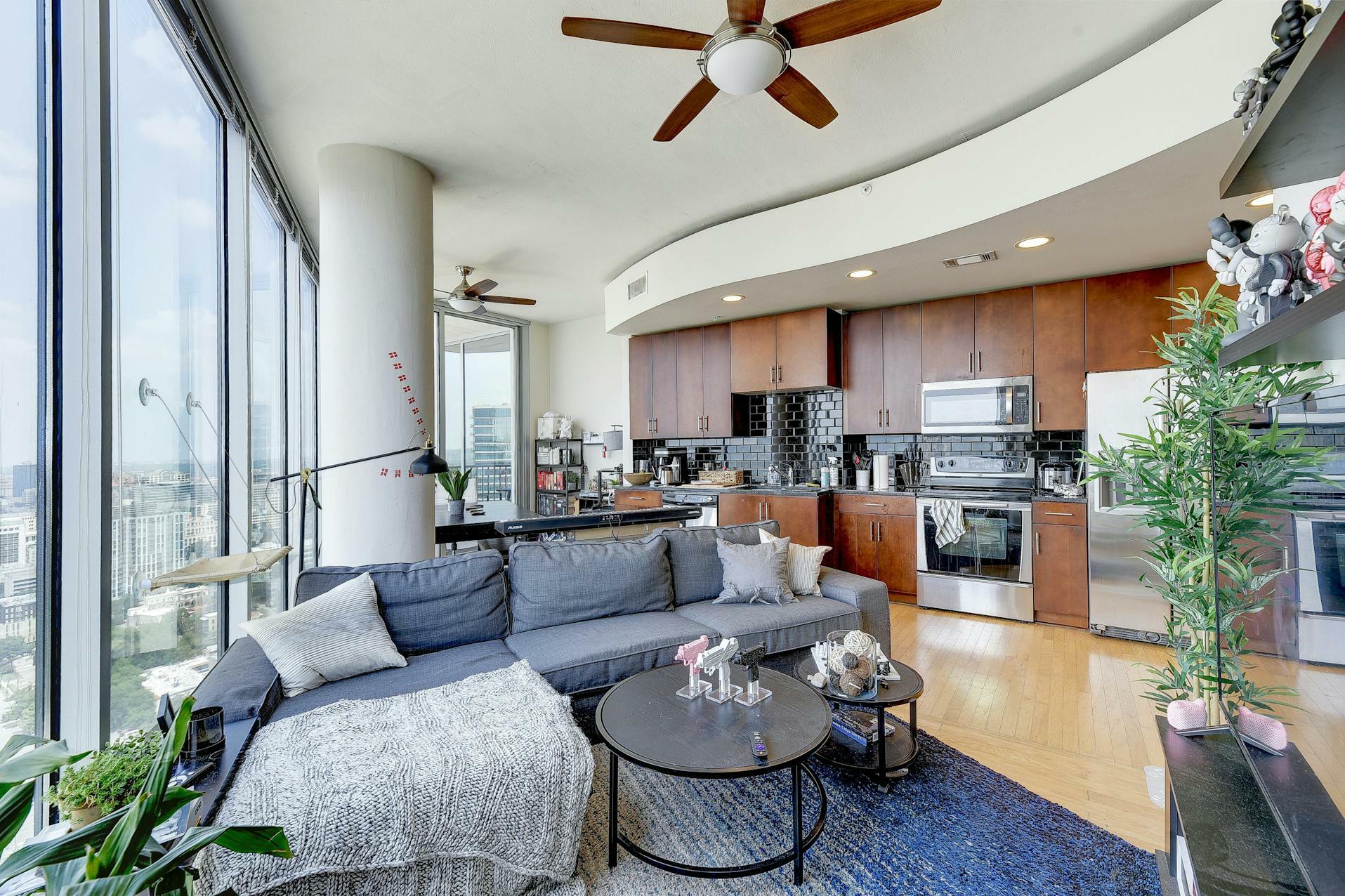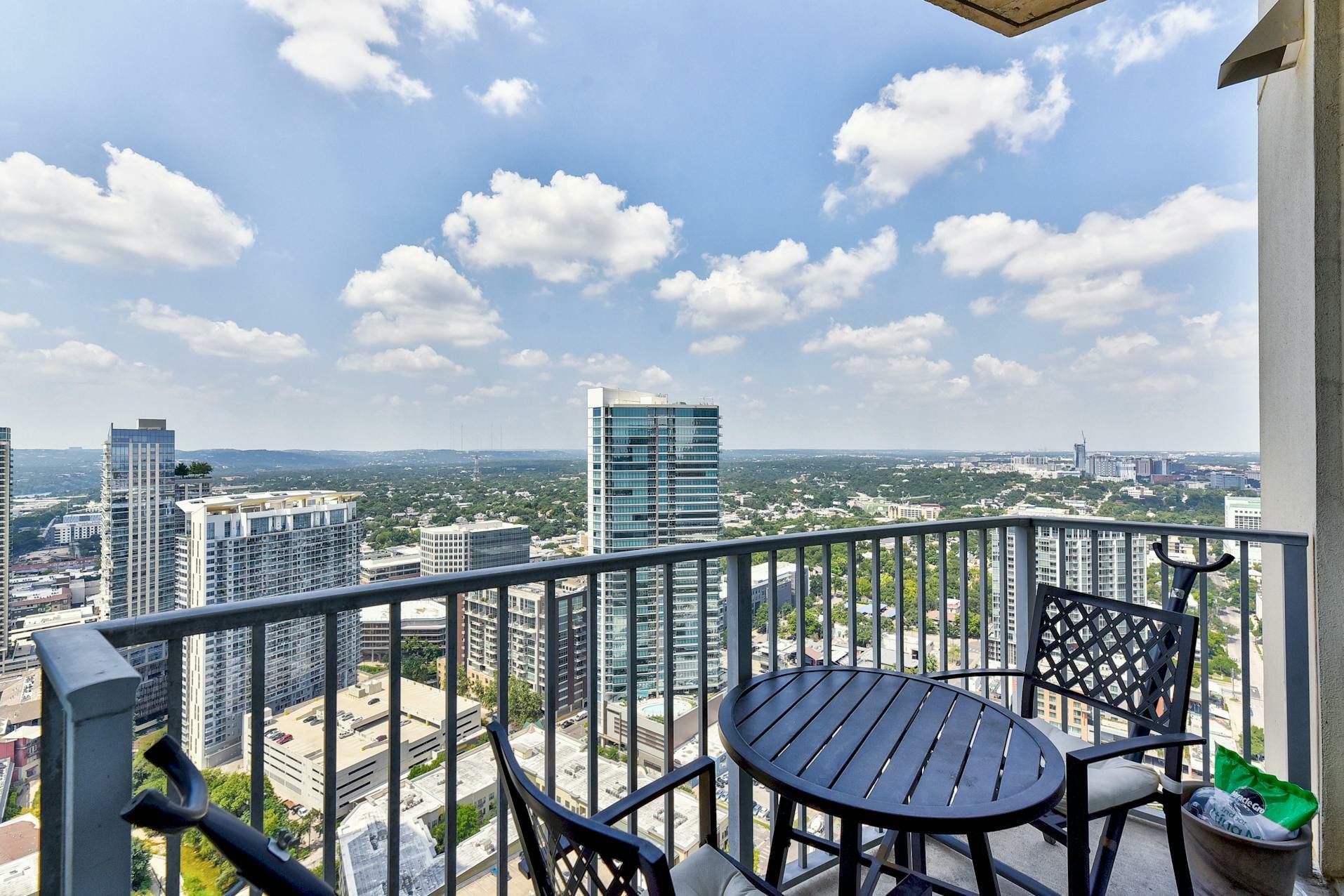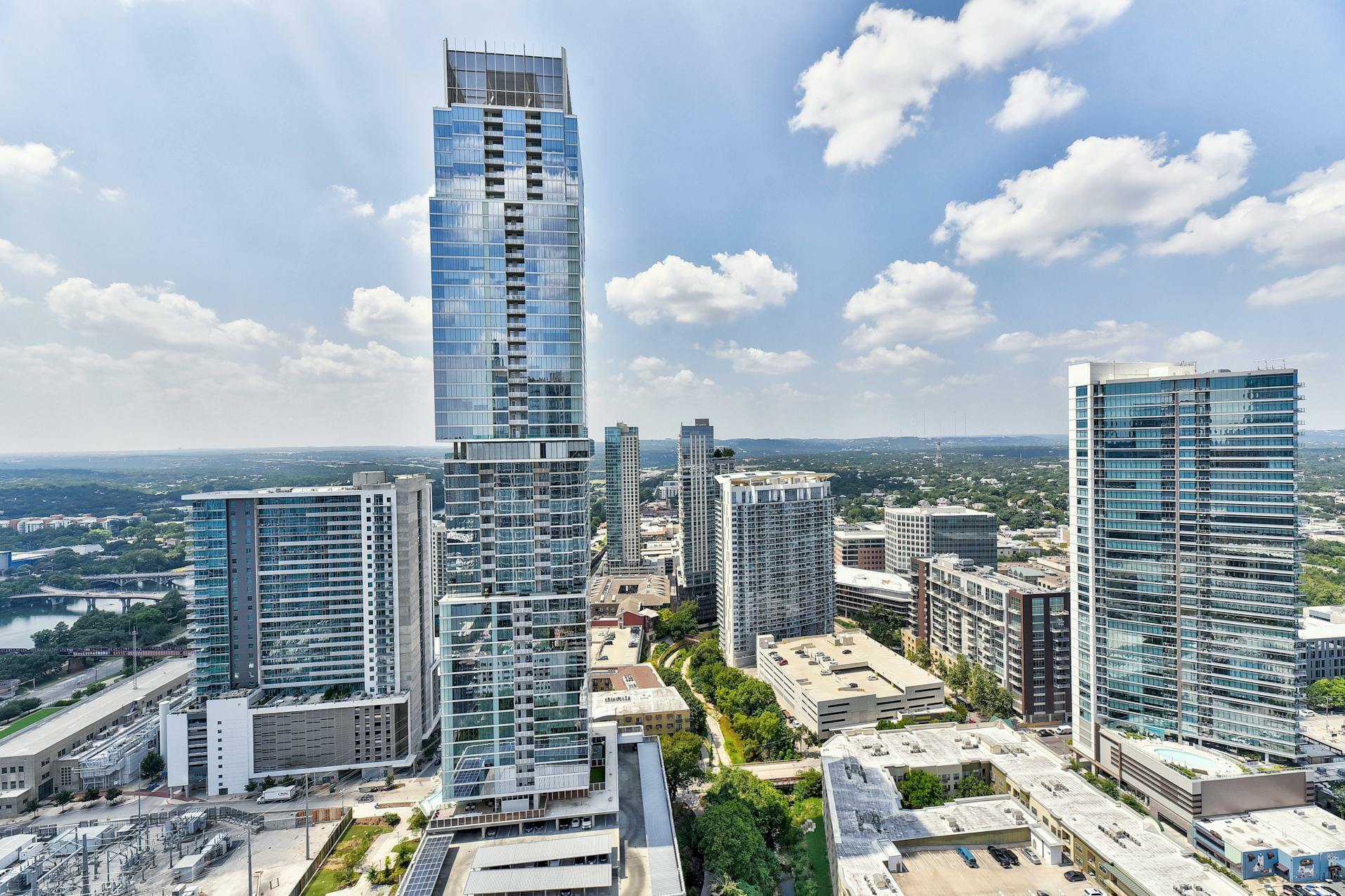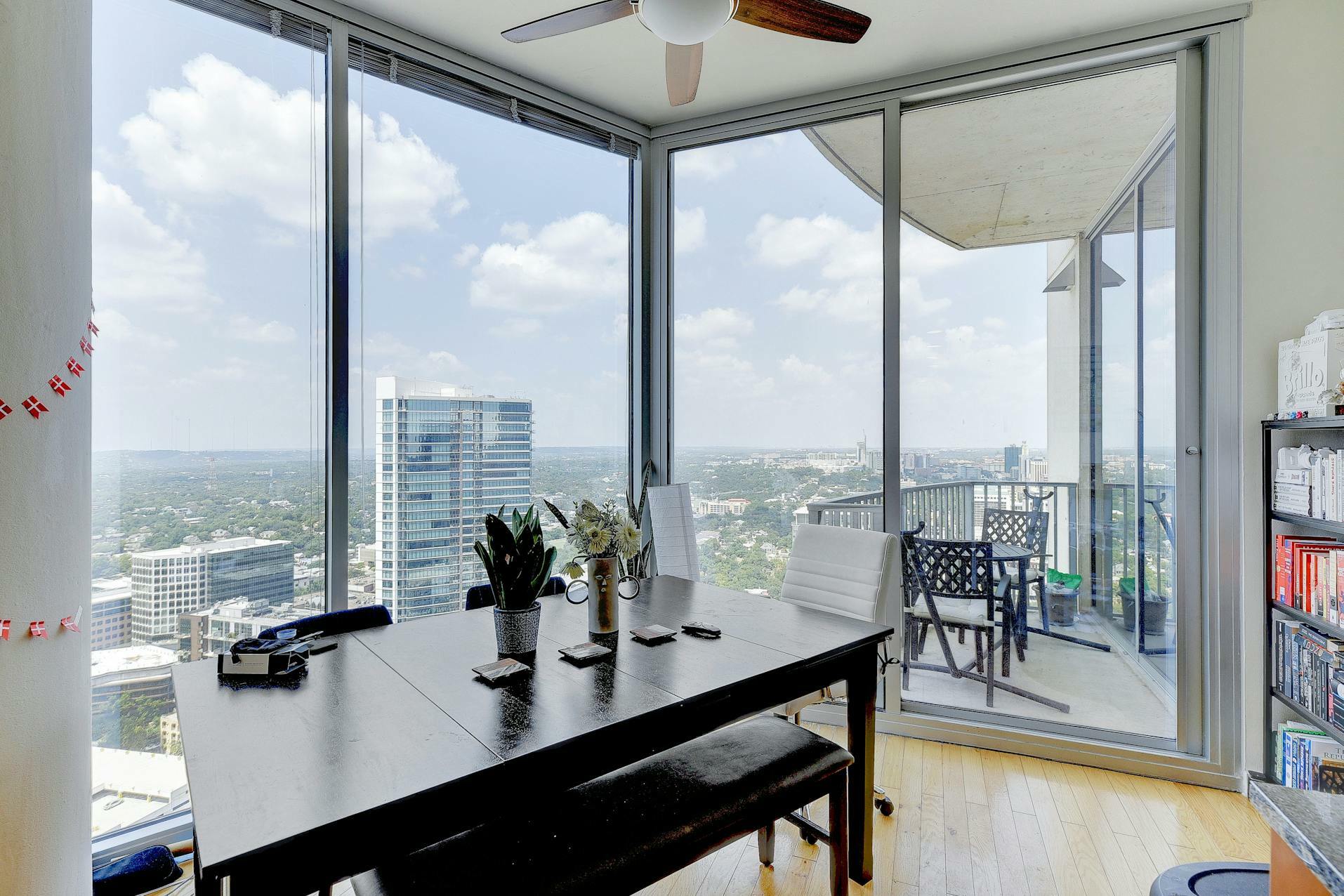 Enjoy breathtaking views of the downtown Austin skyline, Lady Bird Lake, and the hill country from this SE corner unit featuring floor-to-ceiling windows. This beautiful and true one-bedroom residence includes a private balcony and one reserved secure garage parking space. The open floor plan boasts a spacious layout with the kitchen seamlessly flowing into the living and dining areas, showcasing hardwood and tile floors (no carpet), custom lighting, solar shades, granite countertops, subway tile backsplash, stainless steel appliances, and AT&;T fiber is included. Situated in the heart of downtown, 360 High-rise Condominiums offer easy access to Lady Bird Lake, the Ann &; Roy Butler Hike &; Bike Trail, Whole Foods/Trader Joe's, and various dining and entertainment options. Residents can indulge in resort-style amenities such as a pool with cabanas, an outdoor fireplace, grilling stations, a deck with a lounge area, a dog park, 24-hour concierge services, a fitness center, a theater room, a club room with a billiard table, reserved covered garage parking, controlled building access, and street-level retail spaces.