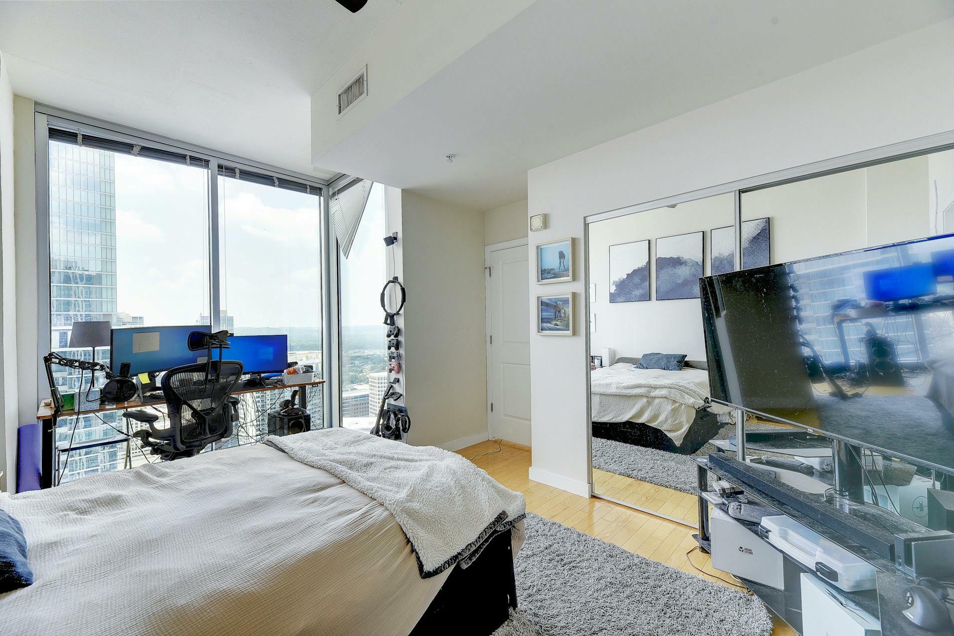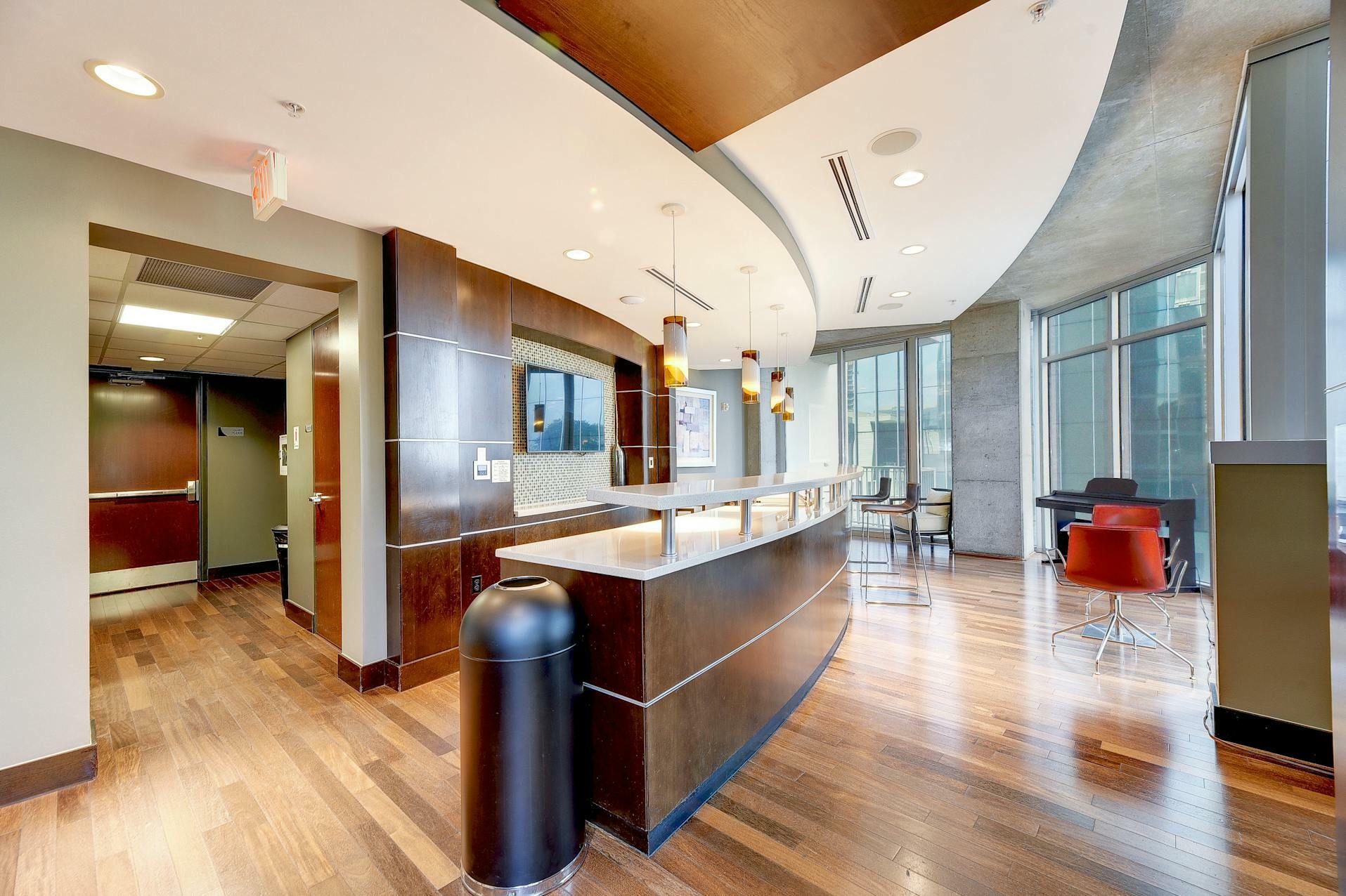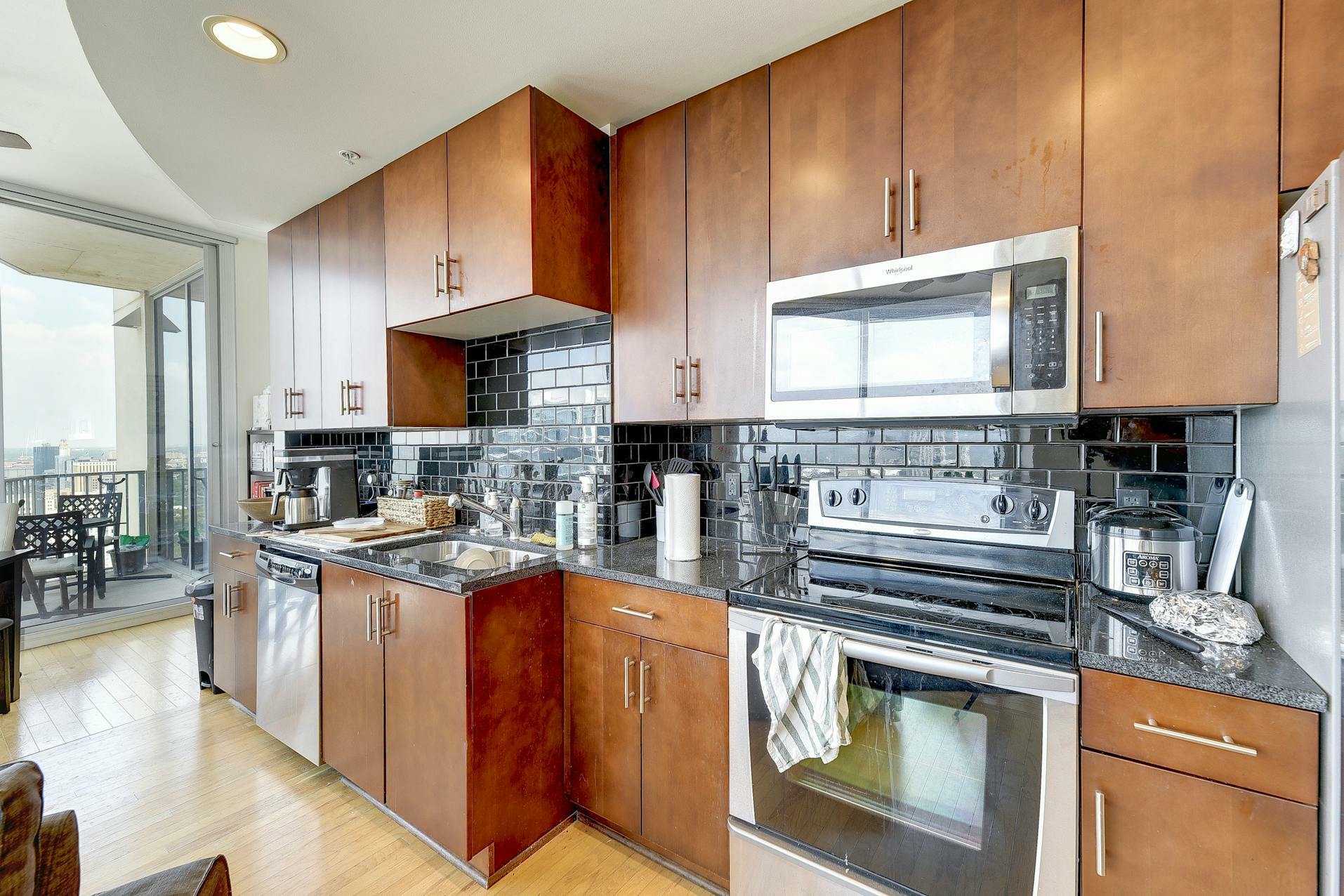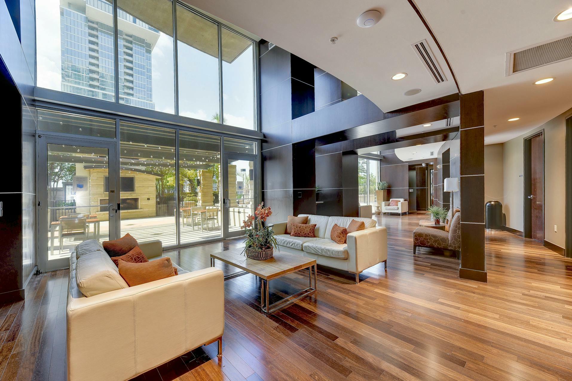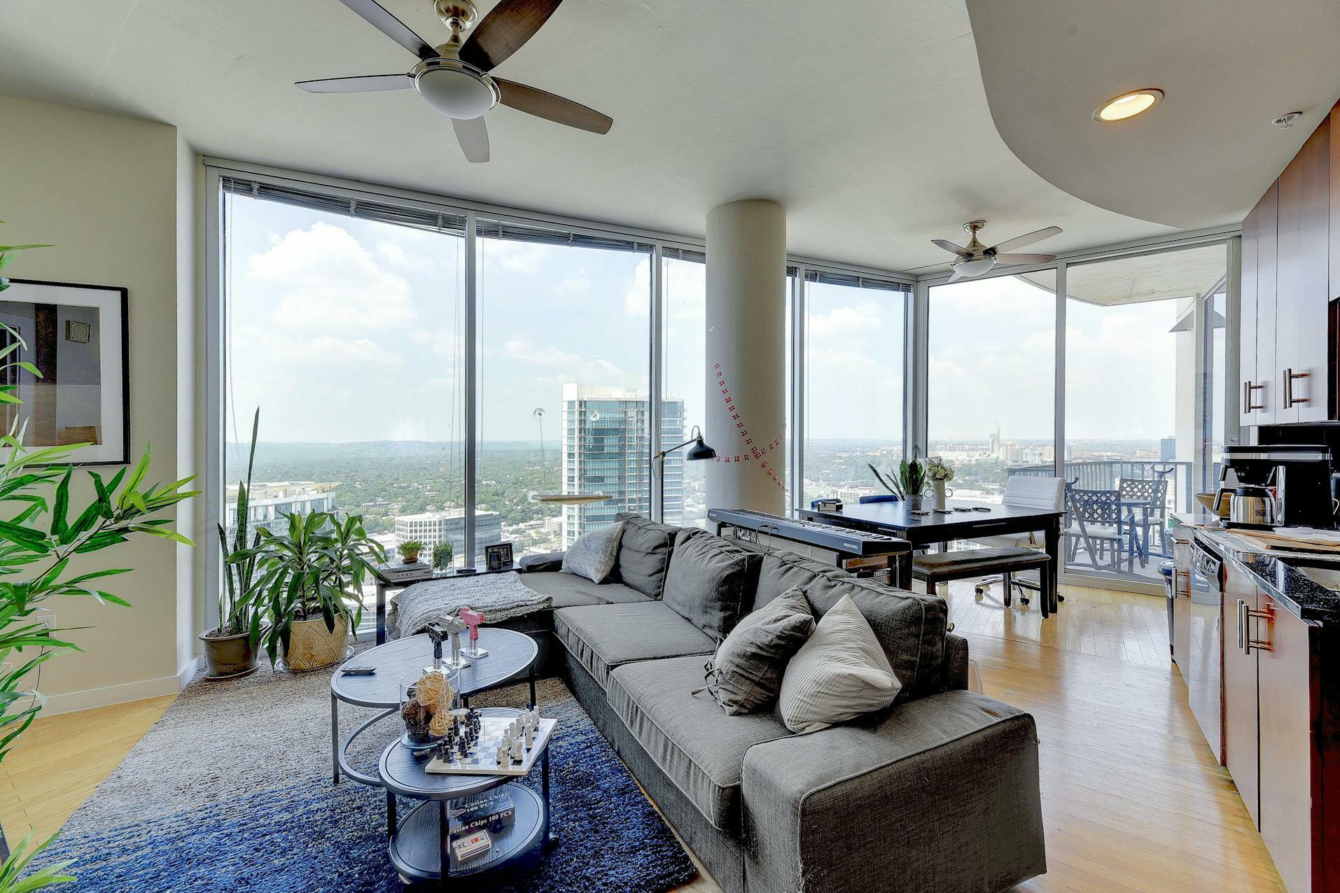 Enjoy breathtaking views of the downtown Austin skyline, Lady Bird Lake, and the hill country from this SE corner unit featuring floor-to-ceiling windows. This beautiful and true one-bedroom residence includes a private balcony and one reserved secure garage parking space. The open floor plan boasts a spacious layout with the kitchen seamlessly flowing into the living and dining areas, showcasing hardwood and tile floors (no carpet), custom lighting, solar shades, granite countertops, subway tile backsplash, stainless steel appliances, and AT&;T fiber is included. Situated in the heart of downtown, 360 High-rise Condominiums offer easy access to Lady Bird Lake, the Ann &; Roy Butler Hike &; Bike Trail, Whole Foods/Trader Joe's, and various dining and entertainment options. Residents can indulge in resort-style amenities such as a pool with cabanas, an outdoor fireplace, grilling stations, a deck with a lounge area, a dog park, 24-hour concierge services, a fitness center, a theater room, a club room with a billiard table, reserved covered garage parking, controlled building access, and street-level retail spaces.