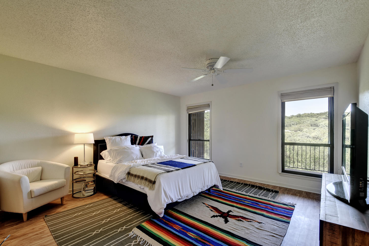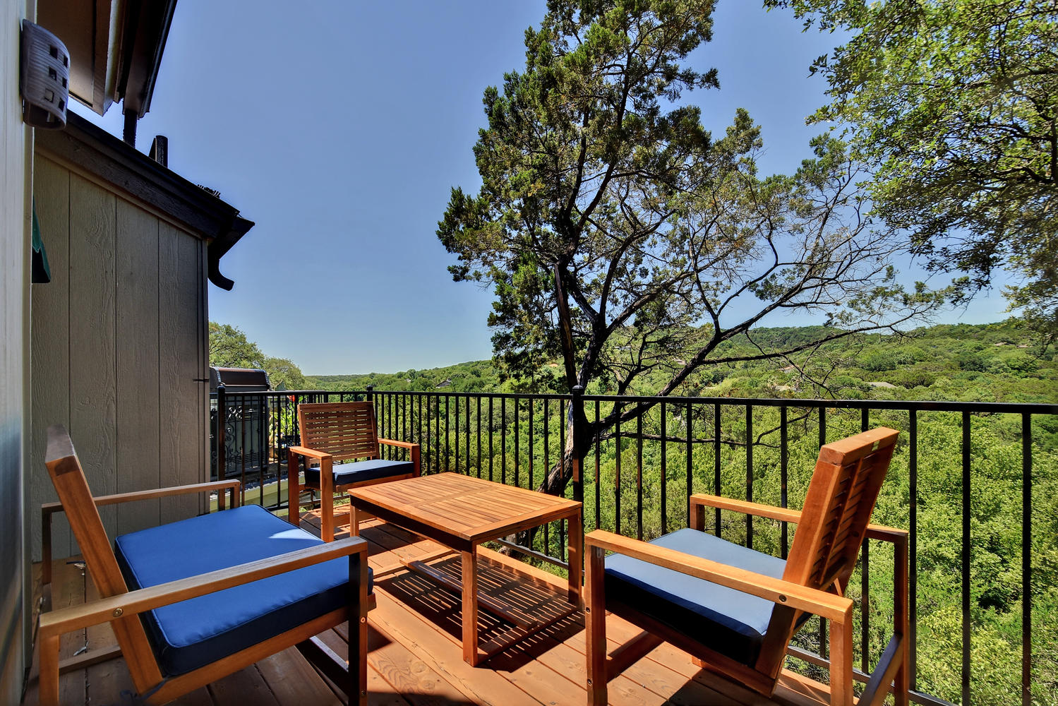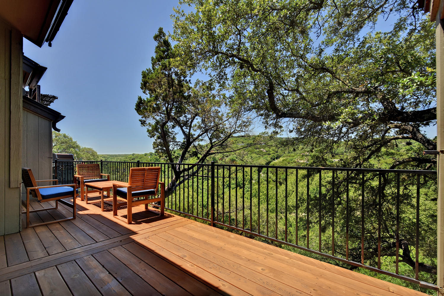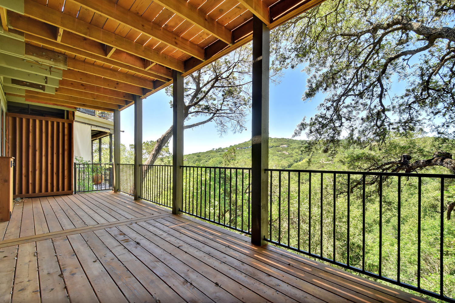 Beautifully remodeled & spacious 2 bed,2 bath condo. One of the few units backing to the greenbelt w/ 2 large decks offering full panoramic views of the hill country. High vaulted ceiling & large windows provide lots of light to the open floor plan. Full wood type & tile floors providing clean, contemporary feel. Large master, private deck off downstairs bedroom, walk-in closet & downstairs laundry room. Fabulous community featuring pool, sauna, club house & tennis courts. Minutes from downtown & in highly acclaimed Eanes ISD.
